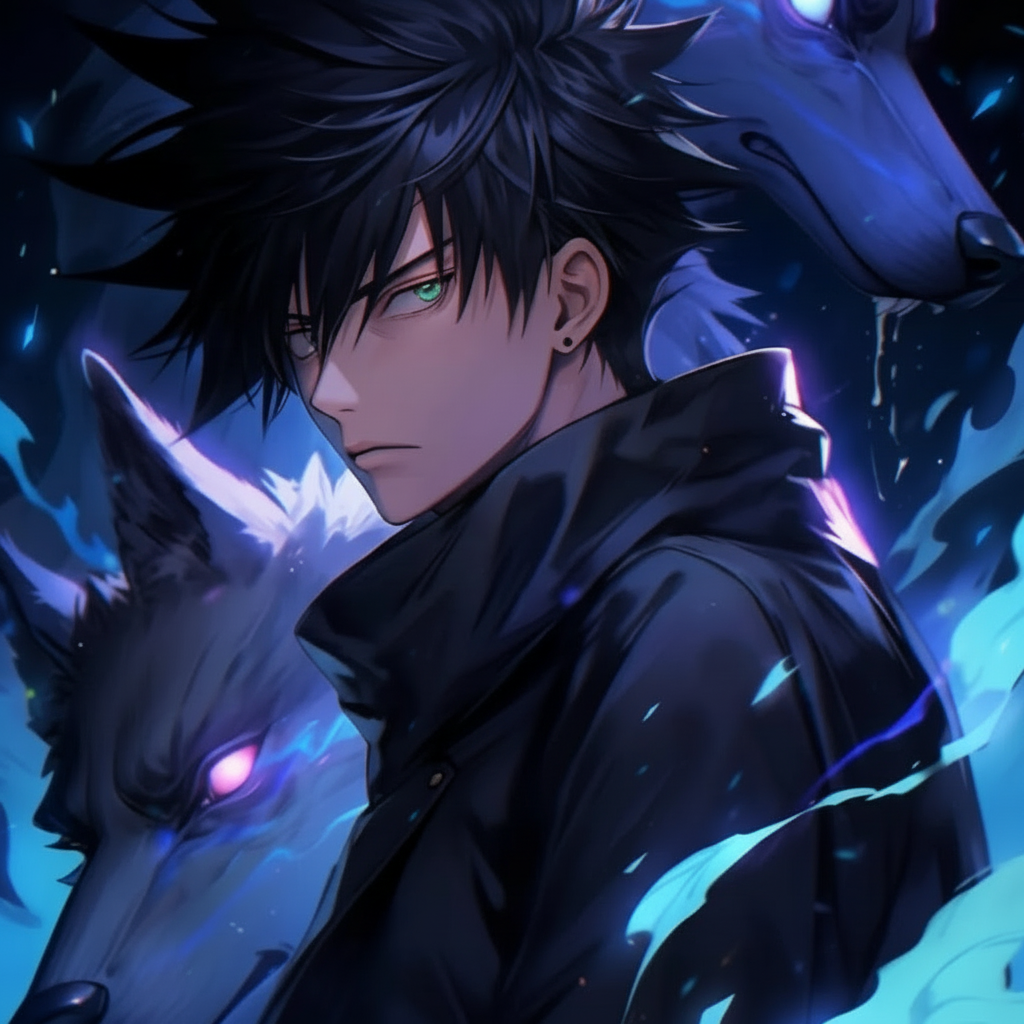 Showcasing Megumi’s tactical genius and dark aesthetic in gaming setups or studios.