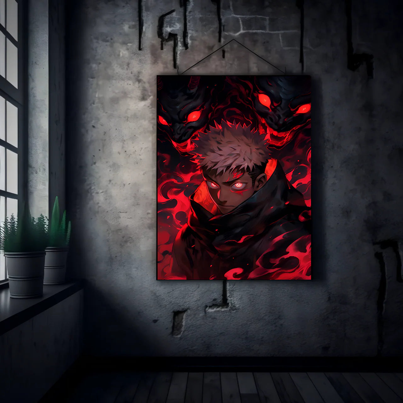 Channel the raw, untamed power of cursed energy with this Yuji dEMON: Cursed Fury Metal Poster. Featuring a striking depiction of Yuji in his most formidable, demonic form, this artwork merges the chaotic allure of cursed spirits with sleek modern metal craftsmanship. The poster captures Yuji mid-battle, veins pulsating with dark energy, eyes glowing with an eerie crimson hue, and cursed symbols swirling around him like a storm. Set against a fractured, shadowy backdrop, the design embodies the duality of human resolve and demonic force.
