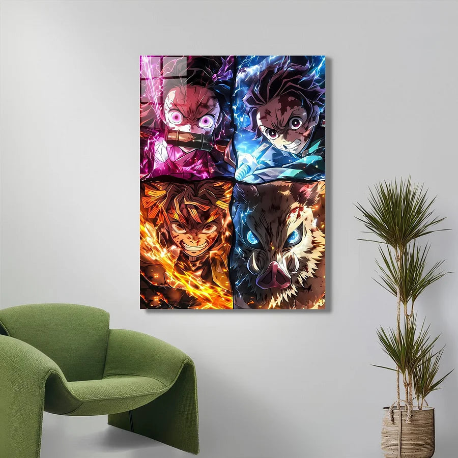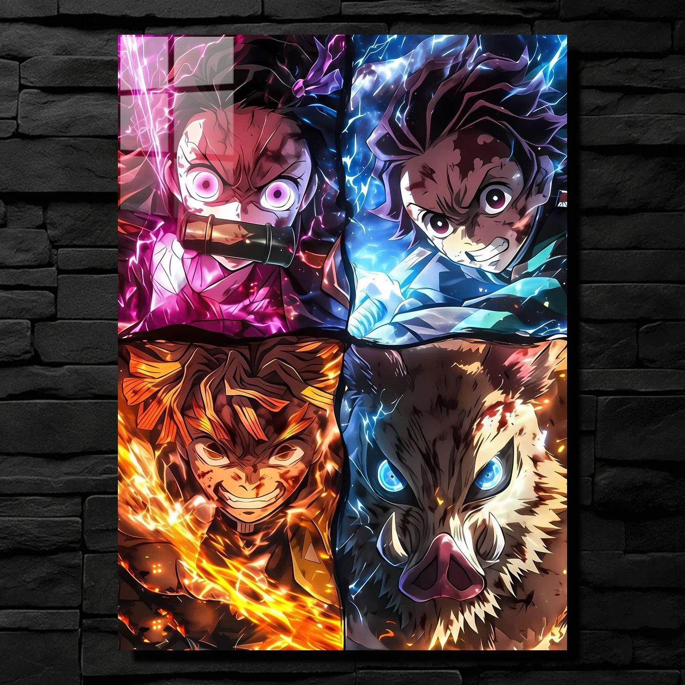 This image features four main characters from the anime *Demon Slayer: Kimetsu no Yaiba*, each depicted in a dynamic and intense pose, surrounded by their respective elemental powers. In the top left, **Nezuko Kamado** is shown with an enraged expression, her eyes glowing pink, and a bamboo muzzle in her mouth. She is surrounded by vibrant pink and purple lightning-like energy. In the top right, **Tanjiro Kamado** is depicted with a determined and fierce expression, his eyes wide and focused. He is surrounded by bright blue lightning-like energy, suggesting his Water Breathing technique. In the bottom left, **Zenitsu Agatsuma** is shown with a wide, almost maniacal grin, his eyes reflecting intense focus. He is engulfed in brilliant orange and yellow lightning-like energy, indicative of his Thunder Breathing technique. In the bottom right, **Inosuke Hashibira**, wearing his signature boar's head mask, is presented with glowing blue eyes that pierce through the mask's eye holes. He is surrounded by blue and white lightning-like energy, conveying his raw power.