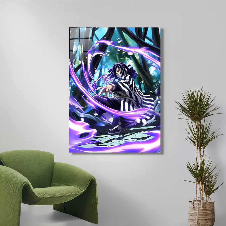 The image features Obanai Iguro from Demon Slayer: Kimetsu no Yaiba, in a dynamic pose. He is crouched down, with his left hand extended forward, and his right hand slightly raised. His body is surrounded by swirling purple energy, which emanates from his hands and wraps around him. Obanai is wearing his signature striped haori over a dark uniform, and a white mask covers his mouth. His distinctive dark, spiky hair and bright green eyes are visible. The background shows a forest with tall, dark trees and a bright blue sky peeking through the canopy.