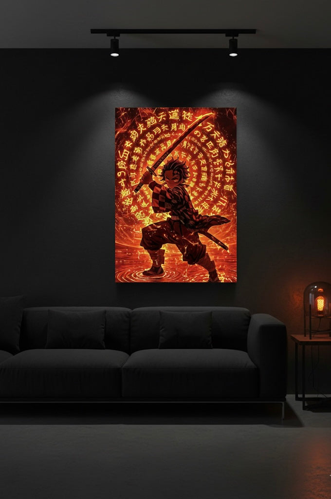 • Appearance & Resolve: Tanjiro is shown in his iconic checkered haori (jacket) and Demon Slayer uniform. His stance is one of fierce determination, reflecting his unwavering resolve in the face of impossible odds.