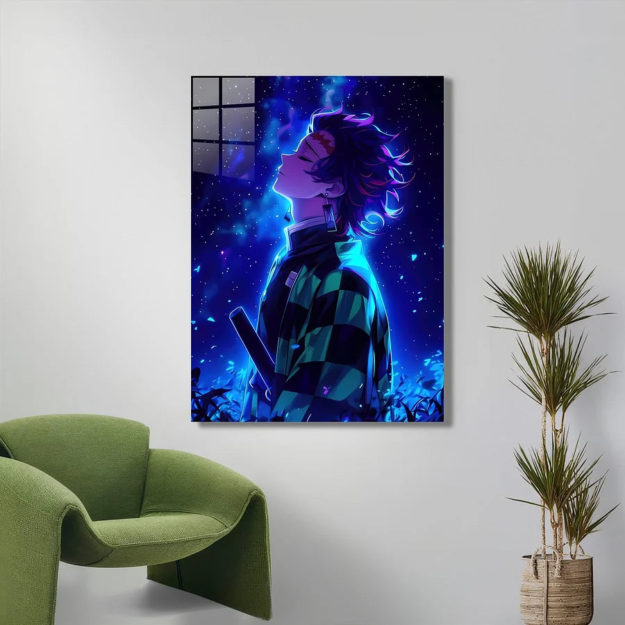 This is an anime-style illustration of **Tanjiro Kamado** from *Demon Slayer*. He is depicted from the chest up, looking upwards with his eyes closed, against a starry, blue-hued night sky. He is wearing his signature green and black checkered haori over a dark uniform, and his hanafuda earrings are visible. His hair has subtle red and purple highlights.