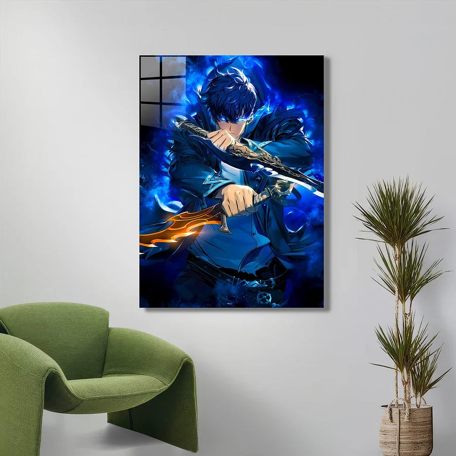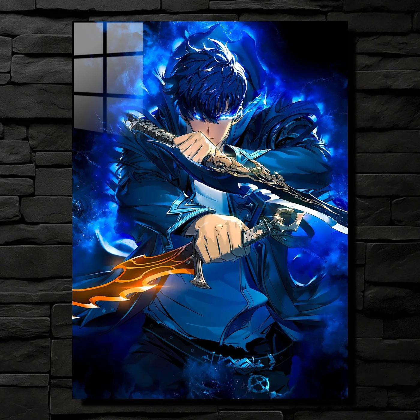 This is an image of Sung Jinwoo from Solo Leveling. He is depicted in a dynamic pose, holding two swords. His eyes glow with a bright blue light, matching the blue aura emanating from his body. He is wearing a dark blue jacket over a lighter blue shirt, and dark pants with a detailed belt. One sword, held in his right hand, has a fiery orange glow along its blade, while the other, held in his left hand, has a more traditional metallic appearance with intricate hilt details.