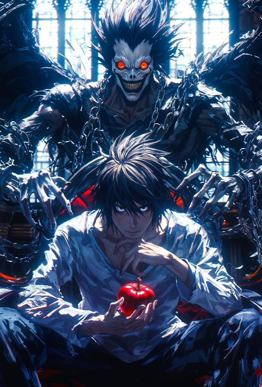 • Ryuk (The Shinigami): The monstrous figure behind him is Ryuk, the original owner of the Death Note that Light found. Ryuk dropped the notebook into the human world out of boredom and acts as a detached, amused spectator to Light's actions. Ryuk is famously obsessed with apples, which Light is seen holding in the artwork, a nod to their strange, symbiotic relationship.