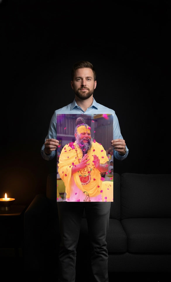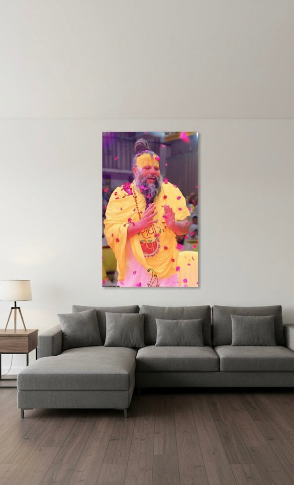 Bring the profound spiritual energy of Vrindavan into your home with this stunning metal print featuring Shri Hit Premanand Govind Sharan Ji Maharaj.