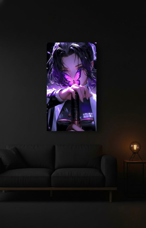 • Appearance: Shinobu is small in stature, has deep purple hair with an indigo streak, and large, compound-like eyes (characteristic of insects). She wears the standard Demon Slayer Corps uniform, but her most notable feature is the butterfly-patterned haori (a traditional Japanese jacket) that belonged to her late sister.