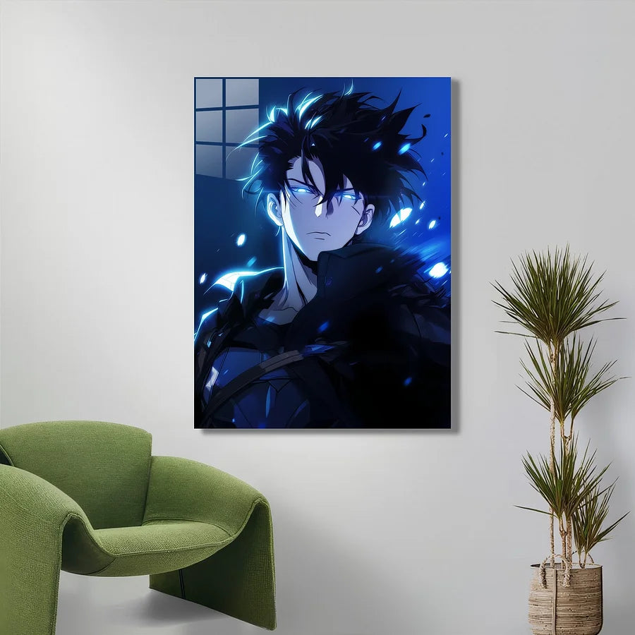 This image features Sung Jinwoo from Solo Leveling, depicted with intense, glowing blue eyes and spiky black hair that also emits a blue aura. He is wearing dark clothing, possibly armor or a jacket, with hints of blue light reflecting off his attire, suggesting he is using his powers. The overall impression is one of power and determination.