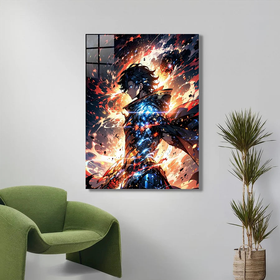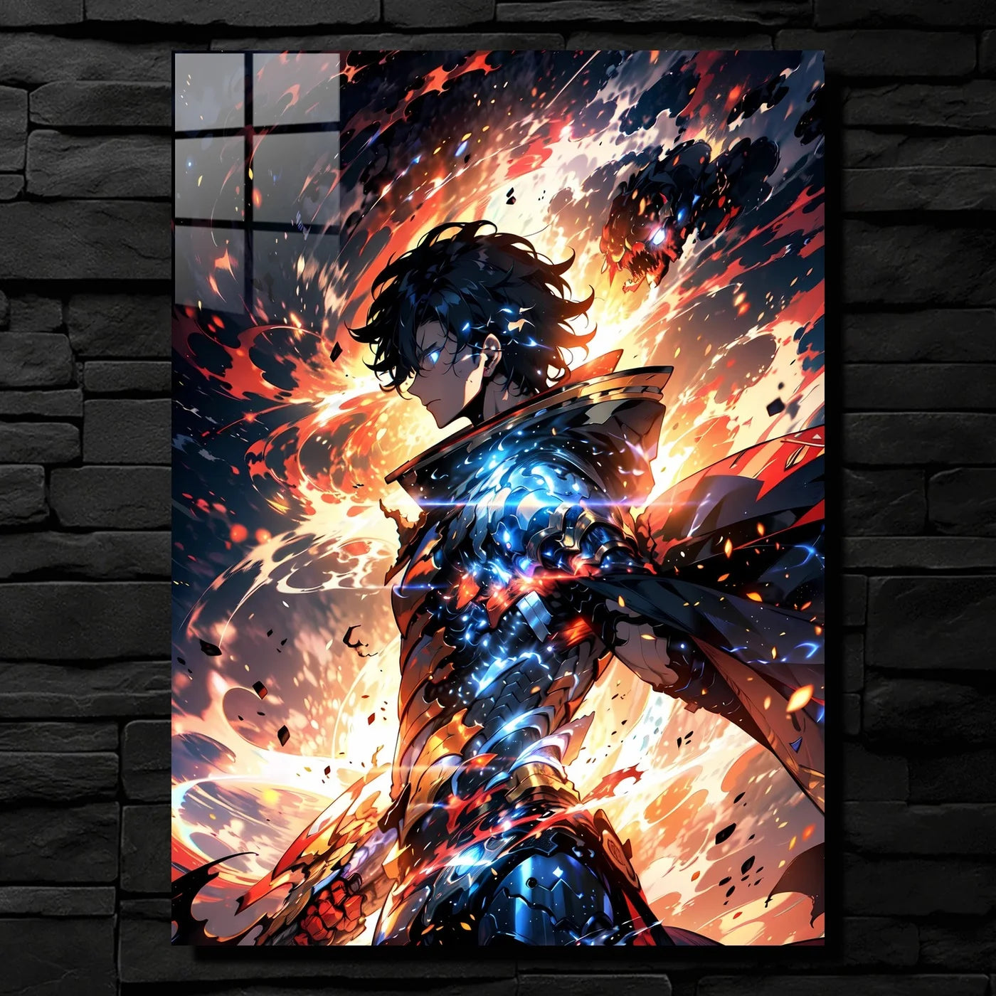 This image depicts **Sung Jin-Woo** from **Solo Leveling**, shown from the waist up in a dynamic, action-oriented pose. He is looking to the left with a serious expression, his blue eyes glowing. He wears dark, intricate armor that glows with blue and orange energy, suggesting powerful abilities. His dark, spiky hair is slightly disheveled. Behind and around him, a fiery, chaotic background with swirling orange and red flames, sparks, and dark smoke creates a sense of intense combat or power manifestation. A shadowy, monstrous head with glowing red eyes is visible in the upper right, possibly an enemy or a summoned shadow.