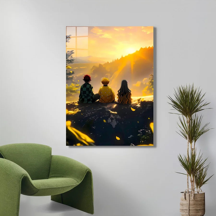 The image features Tanjiro Kamado, Zenitsu Agatsuma, and Nezuko Kamado from Demon Slayer, sitting with their backs to the viewer, looking out at a vibrant sunset over a mountainous landscape.
