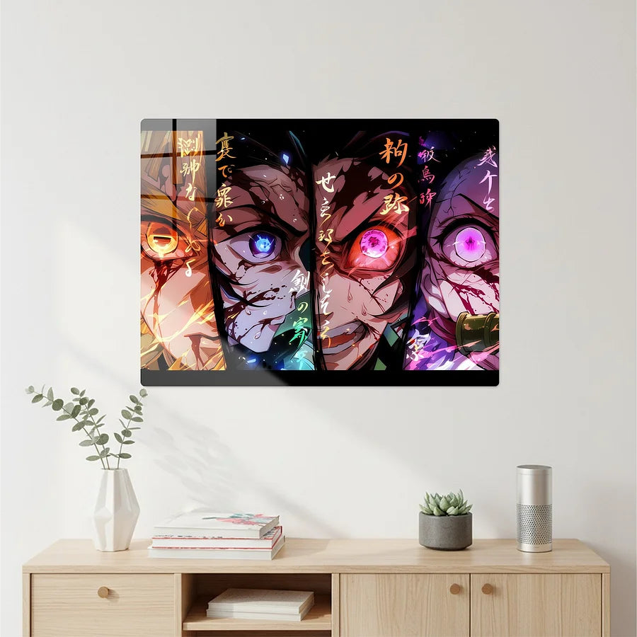 This is a close-up, split-panel image featuring four characters from the anime "Demon Slayer: Kimetsu no Yaiba," each with intense expressions and glowing eyes, depicted with blood splatters and tears. From left to right: 1. **Zenitsu Agatsuma** is shown with his left eye glowing bright yellow/orange, surrounded by yellow lightning-like energy and tears of blood. Japanese text runs vertically next to him. 2. **Inosuke Hashibira** is depicted with his right eye glowing blue with a distinct pattern in the pupil, also with blood splatters and tears. Japanese text runs vertically above his head. 3. **Tanjiro Kamado** is shown with his left eye glowing red/pink, with a similar pattern in the pupil, and visible blood and sweat/tears on his face. Japanese text runs vertically above his head. 4. **Nezuko Kamado** is depicted with her right eye glowing bright pink/purple, with a similar pupil pattern, blood splatters, and her bamboo muzzle visible on the lower right. Japanese text runs vertically above her head.